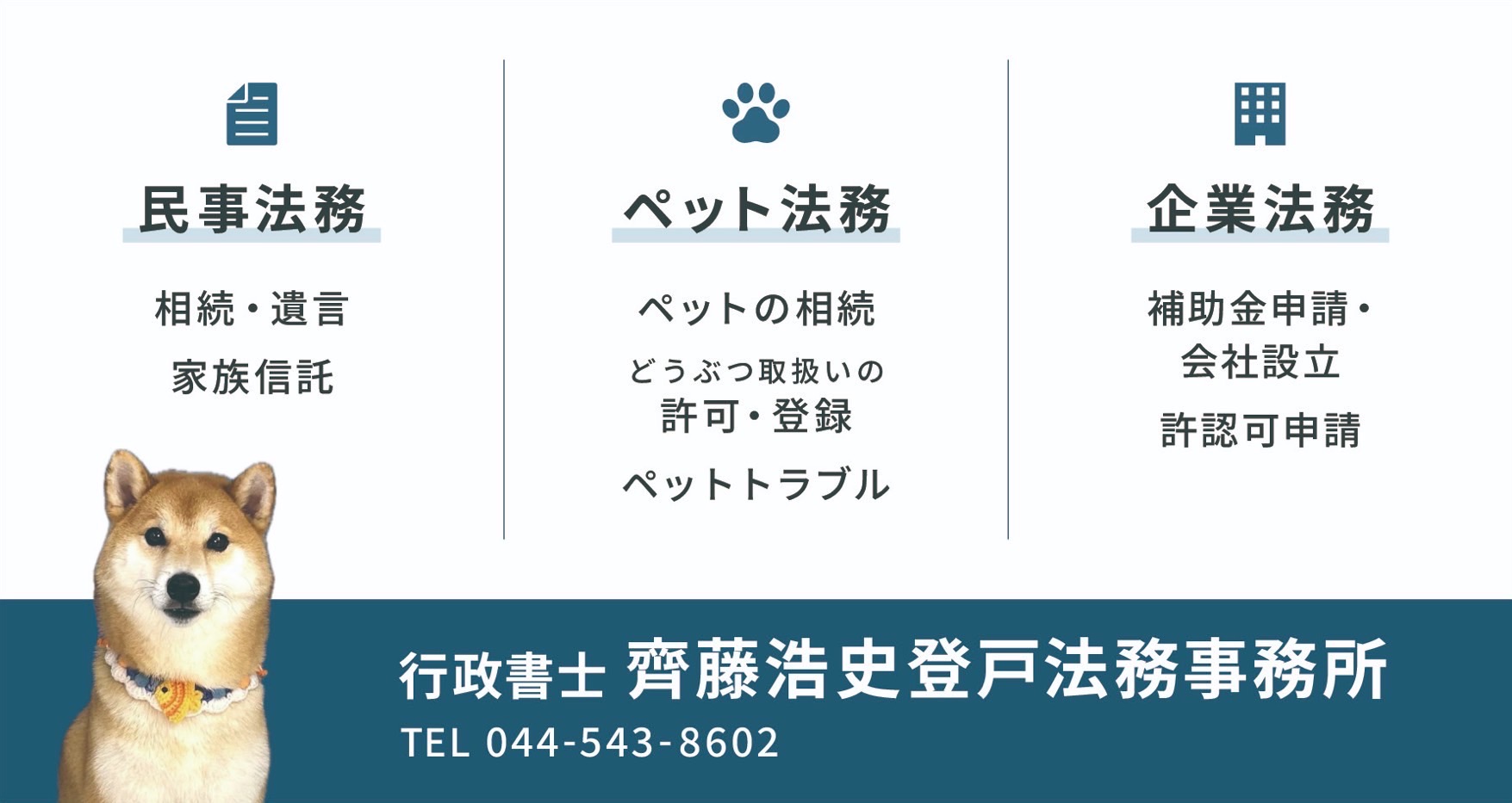 相続・家族信託・遺言・後見・補助金申請サポート・各種許認可おまかせください。 また「ペット法務」(ペットの相続・ペットトラブルなど)もご気軽にご相談ください。